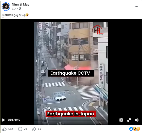 ဧပြီ ၂၀ ရက်က ပြင်းအား ၇ ဒသမ ၅ ရှိတဲ့ ငလျင်ကြီး ဂျပန်နိုင်ငံ ဆန်ရီကူ(Sanriku)ဒေသမှာ လှုပ်ခတ်ခဲ့ပြီး ဆူနာမီ သတိပေးချက် ထုတ်ပြန်ခဲ့ရပါတယ်။ ဒီလိုအခြေအနေမှာ ဂျပန်မှာ ဧပြီ ၂၀ ရက်က လှုပ်ခတ်ခဲ့တဲ့ ငလျင်အတွင်း မြင်ကွင်းတွေဆိုပြီး ဗွီဒီယိုတွေ အွန်လိုင်းမှာ ပျံ့နှံ့မှုအားကောင်းနေတယ်။ ဒါပေမဲ့ တချို့ ဗွီဒီယိုတွေဟာ လတ်တလော အဖြစ်အပျက်နဲ့ သက်ဆိုင်ခြင်းမရှိတာတွေ့ရတယ်။
