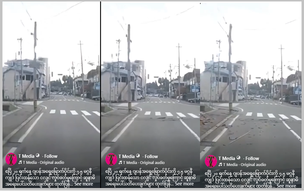 ပျံ့နှံ့မှုအားကောင်းနေတဲ့ ဗွီဒီယိုပို့စ်တခုက ရယူထားတဲ့ စခရင်ရှော့ဓာတ်ပုံနဲ့ စာသားကောက်နုတ်ချက်ကို အောက်မှာကြည့်ပါ။ တူညီတဲ့ မျှဝေမှုကို ဒီနေရာမှာလည်း တွေ့ရတယ်။ ကျေးလက်လမ်းမတခုပေါ်က ကင်မရာမှတ်တမ်းဗွီဒီယိုထဲမှာ အမျိုးသမီးတယောက်ဟာ ကြောက်လန့်အော်ဟစ်နေပြီး ကင်မရာမြင်ကွင်းထဲမှာ မြေပြင်နဲ့ မြင်ကွင်းဟာ ယိမ်းထိုးနေတာတွေ့ရတယ်။