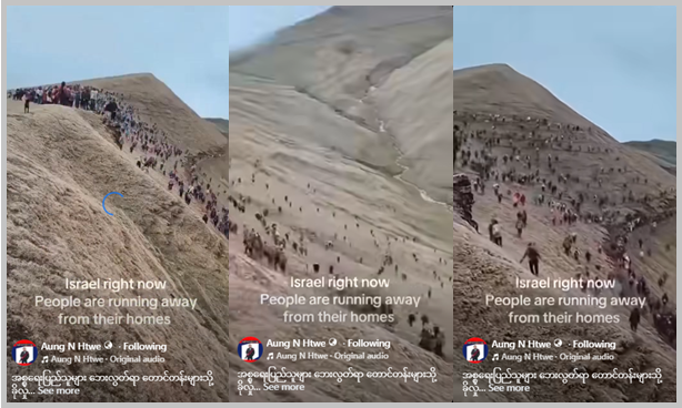 အစ္စရေးမှာ လူထုဟာ ဘေးလွတ်မယ်ထင်တဲ့ တောင်ကုန်းတွေဆီ သွားရောက်ခိုလှုံနေတဲ့ မြင်ကွင်းအဖြစ် ပြောဆိုမျှဝေထားတဲ့ ဗွီဒီယိုဟာ လက်ရှိ အမေရိကန်၊ အစ္စရေးနဲ့ အီရန်တို့အကြား စစ်ပွဲမတိုင်ခင်ကတည်းက အွန်လိုင်းမှာ ပျံ့နှံ့ခဲ့ပြီးဖြစ်တာတွေ့ရတယ်။ တကယ်တမ်းမှာ ဗွီဒီယိုဟာ နီပေါနိုင်ငံ ဒေါ်လ်ပါကုန်းမြင့်ဒေသမှာ အဖိုးတန် ဆေးဘက်ဝင် မှိုရှာဖွေနေကြတဲ့ မြင်ကွင်းဖြစ်တာတွေ့ရတယ်။
