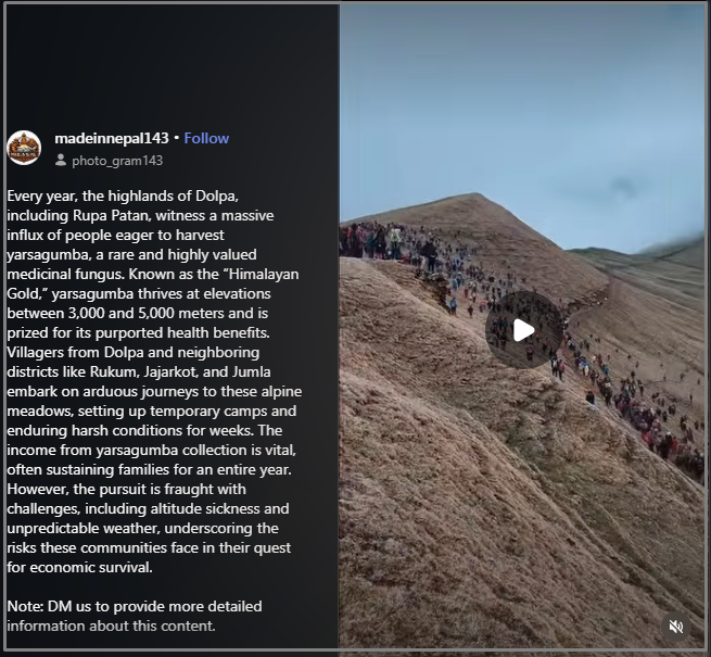 နီပေါနိုင်ငံမှာ ဆေးဘက်ဝင်လို့ နာမည်ကြီးပြီး အဖိုးတန်တဲ့ မှိုတမျိုး ရှာဖွေနေကြတဲ့ မြင်ကွင်း ဗွီဒီယို ဖြစ်တာတွေ့ရတယ်။ ၂၀၂၅ ခုနှစ် ဇွန် ၂ ရက်က madeinnepal143 အမည်နဲ့ အင်စတာဂရမ်အကောင့်မှာ ဒီဗွီဒီယိုကို အောက်ပါအတိုင်း ရေးသားမျှဝေထားတယ်။