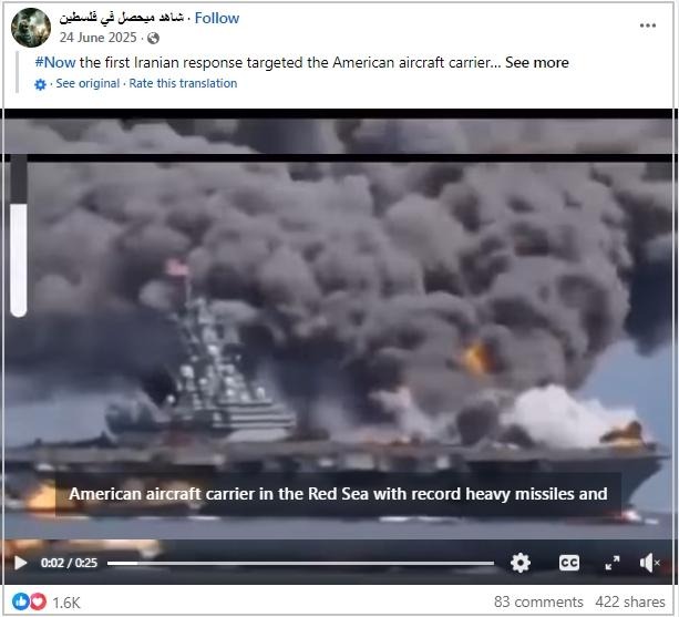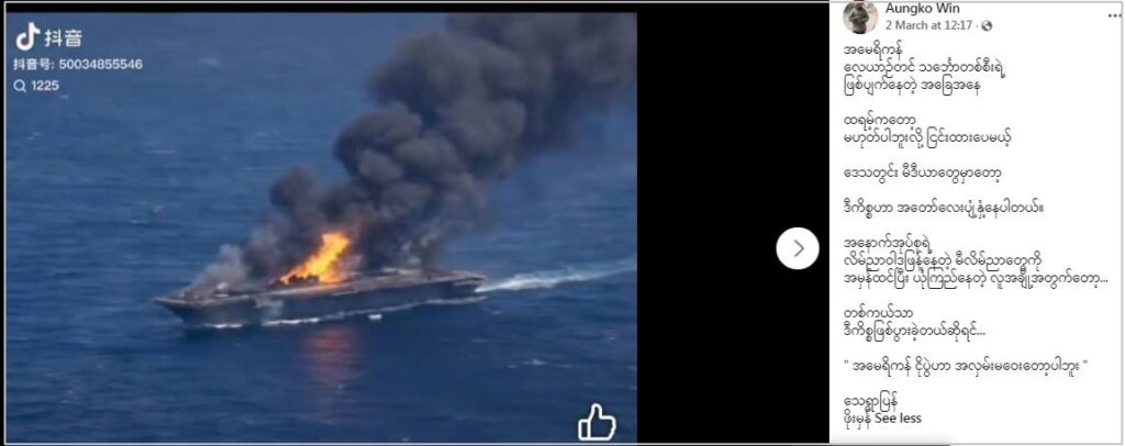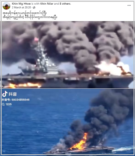 အမေရိကန် လေယာဉ်တင် သင်္ဘောကို အီရန်က တိုက်ခိုက်ပြီးနောက် မီးလောင်နေတယ်လို့ ဆိုထားတဲ့ စခရင်ရှော့ ဓာတ်ပုံတချို့ ဖေ့စ်ဘွတ်မှာ ပျံ့နှံ့မှုအားကောင်းနေတာ တွေ့ရပါတယ်။ သတင်းမှား တခုဖြစ်တာတွေ့ရပြီး မြင်ကွင်းတွေဟာ ကွန်ပျူတာနဲ့ ဖန်တီးထားတဲ့ မြင်ကွင်းတွေ ရယူထားခြင်းဖြစ်တာတွေ့ရတယ်။