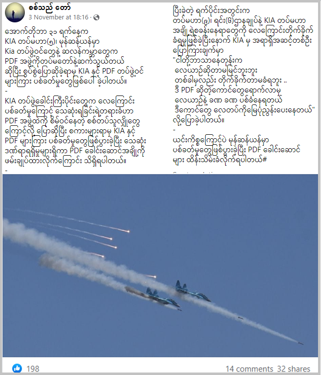 “ငါတို့ဘာသာနေတုန်းက လေယာဉ်ဆိုတာမမြင်ဘူးဘူး တစ်ခါမှလည်း တိုက်ခိုက်တာမခံရဘူး .. ဒီ PDF ဆိုတဲ့ကောင်တွေရောက်လာမှလေယာဉ်နဲ့ ခဏ ခဏ ပစ်ခံနေရတယ် ဒီကောင်တွေ လေတပ်ကိုမြေပုံညွန်းပေး နေတယ်” (မူရင်းအရေးအသား)