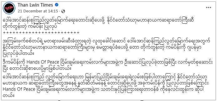 မန္တလေးခေတ်သစ် ယူကျူ့ရဲ့ ဗွီဒီယိုထဲမှာဖော်ပြထားတဲ့ အသံဖိုင်နဲ့ ဖော်ပြခဲ့တဲ့ အကြောင်းအရာဟာ သံလွင်တိုင်းမ် က ဖော်ပြခဲ့တဲ့ “ဒေါ်အောင်ဆန်းစုကြည်လွတ်မြောက်ရေးတောင်းဆိုပေးဖို့ နိုင်ငံတော်သံဃာ့မဟာနာယက ဆရာတော်ကြီးဆီ တိုက်တွန်းတဲ့ ကမ်ပိန်း ပြုလုပ်”ဆိုတဲ့သတင်းနဲ့ တခြား သတင်းတွေကို(ဒီလင့်ခ်နဲ့ ဒီလင့်ခ်မှာကြည့်ပါ) ပြန်လည် အသုံးပြုထားတာတွေ့ရပါတယ်။ ဒေါ်အောင်ဆန်းစုကြည် လွတ်မြောက်ရေးအတွက် သံဃာ့မဟာနာယကဆရာတော်ကြီးတွေအနေနဲ့ မေတ္တာရပ်ခံတောင်းဆိုပေးဖို့ Hands Of Peace ငြိမ်းချမ်းရေးကမ်းလက်များအဖွဲ့က ဦးဆောင်ပြီး ဂျပန်နိုင်ငံမှာ လက်မှတ်စုဆောင်းပြီး တောင်းဆိုစာပေးပို့မယ့် လှုပ်ရှားမှုအကြောင်း သတင်းမှာဖော်ပြပါတယ်။