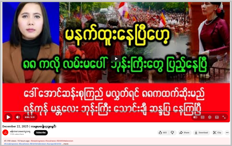 ဗွီဒီယိုကို မျှဝေထားတဲ့ “မန္တလေးခေတ်သစ်”ဟာ သတင်းခေါင်းစဉ်တုတပ် ဗွီဒီယိုတွေ ဖြန့်ချိတဲ့ နေရာဖြစ်တယ်။ဒေါ်အောင်ဆန်းစုကြည်လွတ်မြောက်ရေး မေတ္တာရပ်ခံပေးဖို့ သံဃာ့မဟာနာယက ဆရာတော်ကြီးတွေဆီ ဂျပန်ရောက်မြန်မာတွေ တိုက်တွန်းတဲ့ သတင်းကို ခေါင်းစဉ်တုတပ်ထားတယ်။