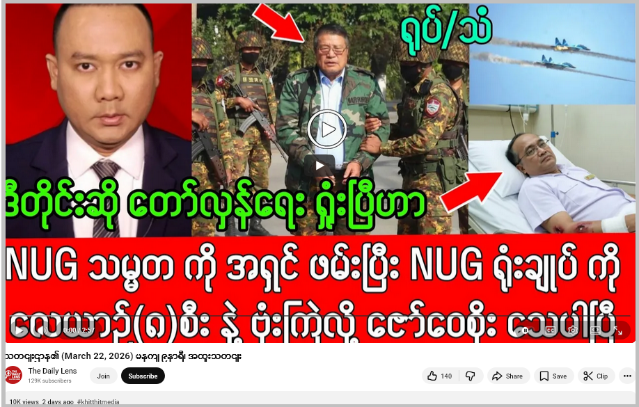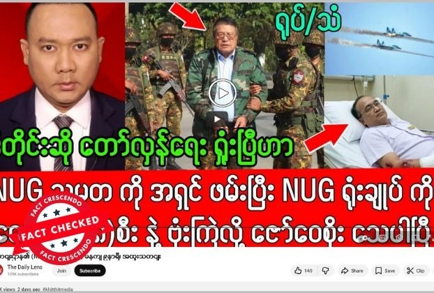 သတင်းလုပ်ငန်းလုပ်ကိုင်နေတဲ့ အဓိကကျတဲ့ မီဒီယာတွေနဲ့ ယုံကြည်ရတဲ့ သတင်းအရင်းအမြစ်တွေမှာ NUG သမ္မတအဖမ်းခံရတဲ့ ကိစ္စဖြစ်စေ NUG ရုံးချုပ် ဗုံးကြဲတိုက်ခိုက်ခံရမှုဖြစ်စေ၊ ပြည်ထောင်စုအစိုးရရုံးဝန်ကြီး ဒေါက်တာဇော်ဝေစိုး သေဆုံးမှုဖြစ်စေ ဖော်ပြချက်မတွေ့ရပါဘူး။ “The Daily Lens”ယူကျူ့ချန်နယ်ဟာ သတင်းမီဒီယာတချို့က သတင်းတွေကို သတင်းခေါင်းစဉ်တုတပ်ပြီး ဖြန့်ချိတာ၊ လုပ်ကြံရေးသား ပြောဆိုချက်တွေ ရောနှော ဖြန့်ဝေတာတွေ ပြုလုပ်တဲ့နေရာဖြစ်တယ်။ ဒီချန်နယ်နဲ့ ပတ်သက်ပြီး Fact Crescendo Myanmar မှာ အချက်အလက်စိစစ်ချက် မကြာခဏဖော်ပြခဲ့ပြီးဖြစ်တယ်။