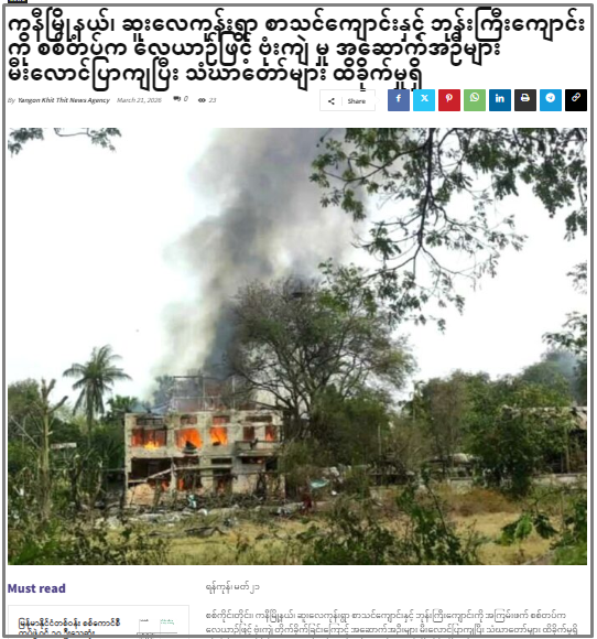 ကနီမြို့ ဆူးလေကုန် ဘုန်ကြီးကျောင်းနဲ့ စာသင်ကျောင်းကို စစ်တပ်က လေယာဉ်တွေနဲ့ ဗုံးကြဲခဲ့တာကြောင့် လူအများအပြား ထိခိုက်သေဆုံးခဲ့တယ်ပါတယ်။ ဒါပေမဲ့ NUG သမ္မတကို စစ်တပ်က ဖမ်းလိုက်ပြီးဆိုတာဖြစ်စေ ဒီတိုက်ခိုက်ခံရတဲ့ နေရာဟာ NUG ရုံးချုပ်ဖြစ်တယ်ဆိုတာဖြစ်စေ၊ ဗုံးကြဲခံရမှုမှာ ဒေါက်တာဇော်ဝေစိုး သေဆုံးတယ်ဆိုတာဖြစ်စေ အထောက်အထားမရှိဘဲ သတင်းတုဖြန့်ချိနေခြင်းဖြစ်တာတွေ့ရတယ်။