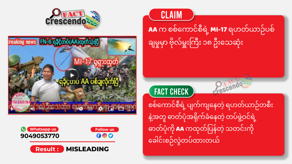 Title:Fact Check: AA က စစ်ကောင်စီရဲ့ MI-17 ရဟတ်ယာဉ်ပစ်ချမှုမှာ ဗိုလ်မှူးကြီး ၁၈ ဦးသေဆုံးဆိုတဲ့ နားလည်မှုလွဲစေနိုင်တဲ့ သတင်းမှား