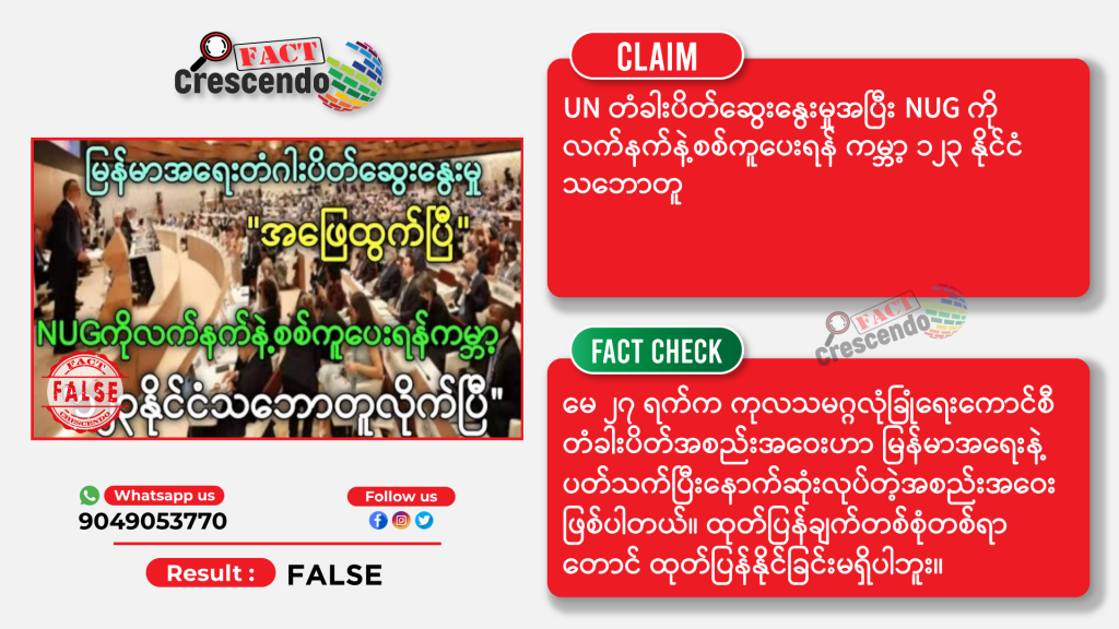“မြန်မာအရေးတံဂါးပိတ်ဆွေးနွေးမှုအဖြေထွက်ပြီ။NUG ကိုစစ်ကူပေးရန် ကမ္ဘာ့ ၁၂၃ နိုင်ငံ သဘော တူလိုက်ပြီ” ဆိုတဲ့အချက်အလက်နဲ့ပတ်သက်ပြီး UN ဝက်ဘ်ဆိုဒ်အပါအဝင်အခြားသော ပြည်တွင်းပြည်ပသတင်း ဌာနတွေမှာ မတွေ့ရပါဘူး။ မြန်မာအရေးနဲ့ပတ်သက်ပြီး ကုလသမဂ္ဂလုံခြုံရေးကောင်စီ တံခါးပိတ်အစည်းအဝေးပွဲကို မေ ၂၇ ရက်နေ့ကကျင်းပခဲ့တာတော့ရှိပါတယ်။ ဒီအစည်းအဝေးမှာ ထုတ်ပြန်ချက်ထုတ် ပြန်ခဲ့တာမရှိဘူးလို့လည်း ဒီလုံခြုံရေးကောင်စီရဲ့တရားဝင်ထုတ်ပြန်မှုမှာဖော်ပြထားပြီး အစည်းအဝေးအကြောင်း အကျဉ်းချုပ်ဖော်ပြချက် ကိုတော့ ဒီလင့်ခ်မှာတွေ့ရပါတယ်။