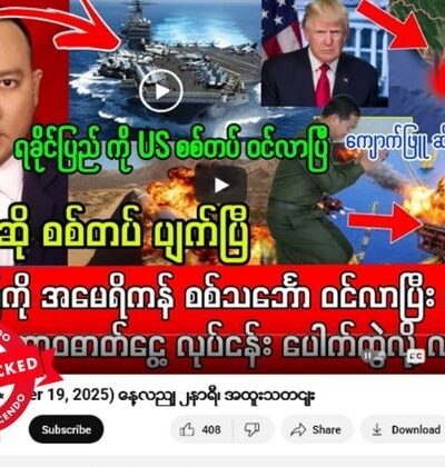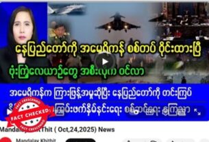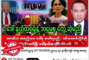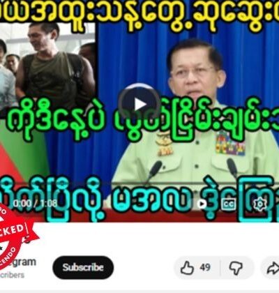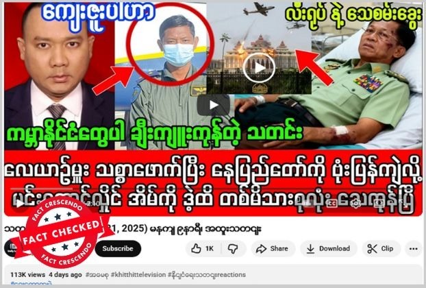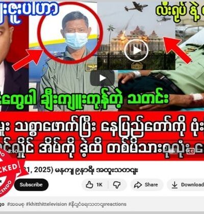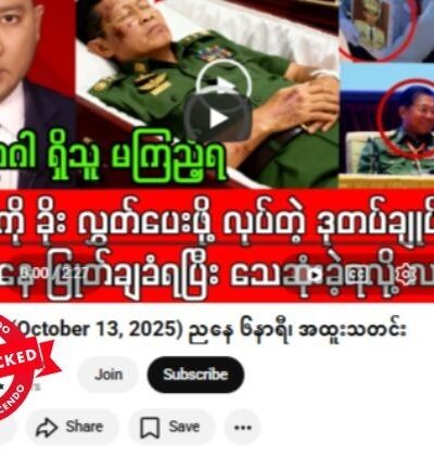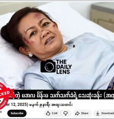 နေပြည်တော်ကို လေယာဉ်နဲ့ ဗုံးကြဲခံရပြီး စစ်ခေါင်းဆောင်နဲ့ အပေါင်းအပါတွေ သေဆုံးခဲ့တယ်လို့ ဆိုထားတဲ့ ဗွီဒီယိုတွေ ယူကျူ့မှာ ပျံ့နှံ့မှု အားကောင်းလျက်ရှိတယ်။ နားလည်မှုလွဲမှာစေနိုင်တဲ့ ပြောဆိုမျှဝေမှုတွေသာဖြစ် တယ်။ ပျံ့နှံ့မှုအားကောင်းနေတဲ့ ဗွီဒီယိုပို့စ်တခုက ရယူထားတဲ့ စခရင်ရှော့ဓာတ်ပုံနဲ့ စာသားကောက်နုတ်ချက်ကို အောက်မှာကြည့်ပါ။ အလားတူးတဲ့ ရေးသားမျှဝေမှုတွေကို ဒီနေရာမှာလည်း တွေ့ရပါတယ်။ Original link | Archive link အချက်အလက်စိစစ်ချက် ဗွီဒီယိုဖြန့်ဝေထားတဲ့ “The Daily Lens”အမည်နဲ့ ယူကျူ့ချန်နယ်ဟာ သတင်းမီဒီယာတချို့က သတင်းတွေကို ကူးယူဖော်ပြပြီး သတင်းခေါင်းစဉ်တုတပ်ကာ ပြန်လည်ဖြန့်ချိတာ ဒါမှမဟုတ် လုံးဝလုပ်ကြံပြောဆိုတာတွေ ပြုလုပ်တဲ့နေရာတခုဖြစ်တယ်။ ဒီချန်နယ်နဲ့ ပတ်သက်ပြီး Fact Crescendo Myanmar ရဲ့ ပြီးခဲ့တဲ့ ရက်ပိုင်းအတွင်း အချက်အလက်စိစစ်ဖော်ပြချက်တွေကို ဒီလင့်ခ်မှာ ကြည့်ပါ။ အခုလည်း […]